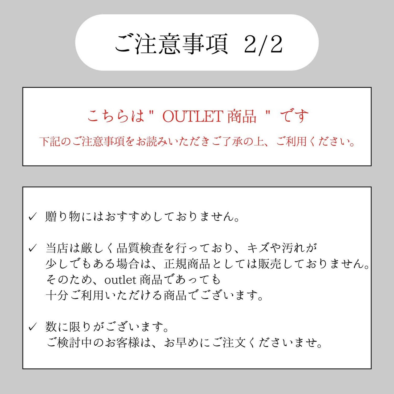 ✔ OUTLET商品のため、商品発送後のキャンセルは お受けいたし兼ねます。