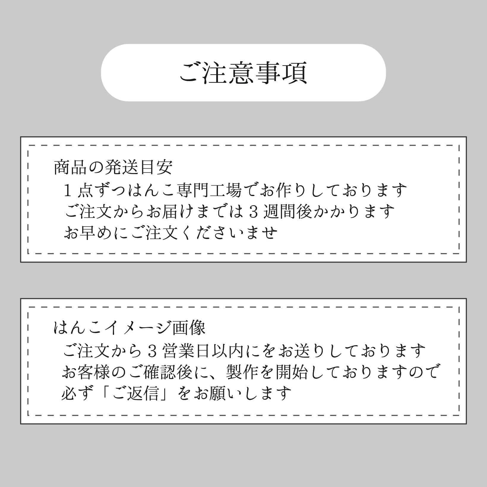 お客様よりご返信いただき、イメージ画像が確定した後、10営業日前後で発送しております。
